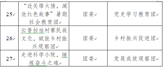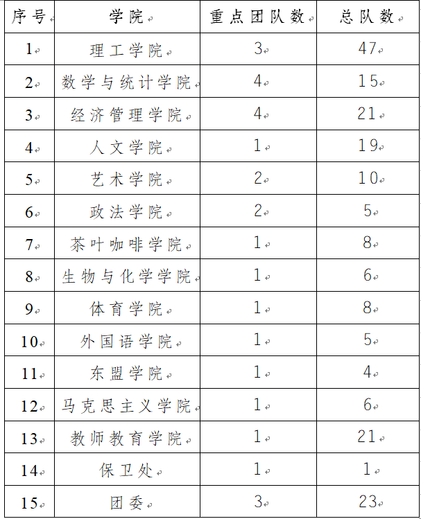 为深入学习宣传贯彻习近平新时代中国特色社会主义思想,全面贯彻落实党的二十大精神,聚焦省第十一次党代会精神和省委“3815”战略发展目标,切实发挥共青团作为广大青年在实践中学习中国特色社会主义和共产主义的学校作用,引导和帮助广大青年学生在与现实相结合的“大思政课”中“受教育、长才干、作贡献”,团结引领青年坚定跟党走、奋进新时代,持续引领我校学生在社会实践中了解国情、感知社情、体察民情,根据《2023年普洱学院大学生志愿者暑期“三下乡”社会实践活动通知》要求,经个人申报,各部门(二级学院)选拔推荐,校团委组织评审,截止目前全校共组队199支,其中校级重点团队27支,最终团队以9月份上交材料为准,上交的材料作为评先评优的重要依据,现将2023年普洱学院暑期“三下乡”社会实践组队申报情况及校级重点团队名单公示如下: