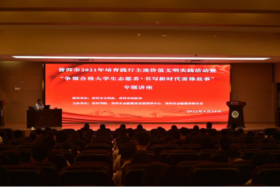 2021年9月24日(星期五)晚上19:30—21:30,由普洱市文明办、普洱市民政局指导,普洱学院、普洱市志愿服务发展指导中心、普洱市志愿服务联合会联合主办的“争做合格大学生志愿者•书写新时代雷锋故事”专题讲座在普洱学院举行。