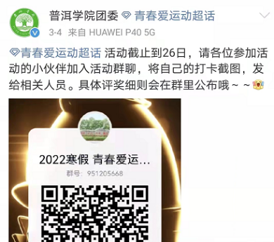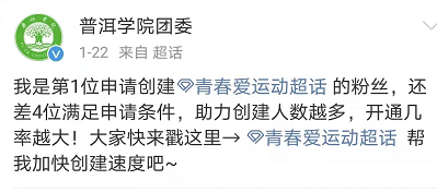 在普洱学院团委微博上开展“青春爱运动 健康强中国”为主题的微博超话,截止目前超话阅读关注度达3402.3万人次。