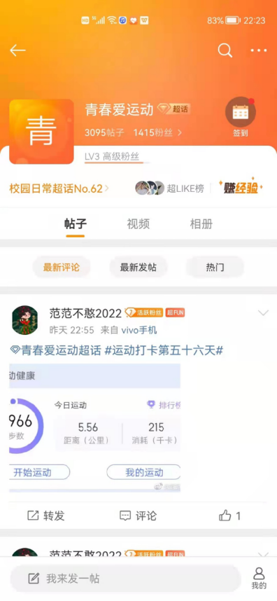本次微博超话活动得到了学生的强烈反响,从活动开展以来,共有1416人参与打卡活动,发帖量3096贴,阅读关注度达3402.3万人次,截止目前,根据活动要求最终有49名同学获得了“青春爱运动 健康强中国”运动之星称号。