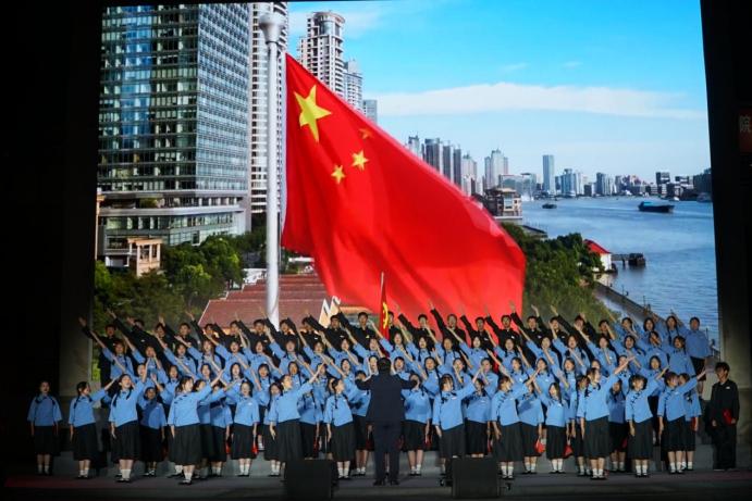 随后,全体起立,奏唱中华人民共和国国歌。