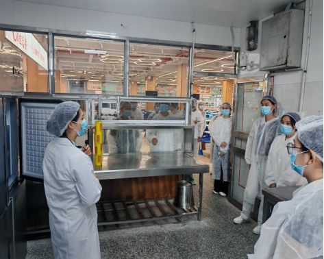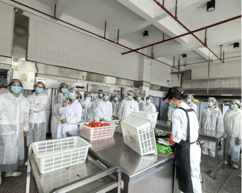 师生代表在统一穿戴防护装备后,依次参观食品贮存、加工、烹饪及留样等区域,全面了解食堂在原料采购、卫生管理和操作流程等方面的安全管控措施,直观感受食材从源头到餐桌的全过程管理,强化了食品安全意识。