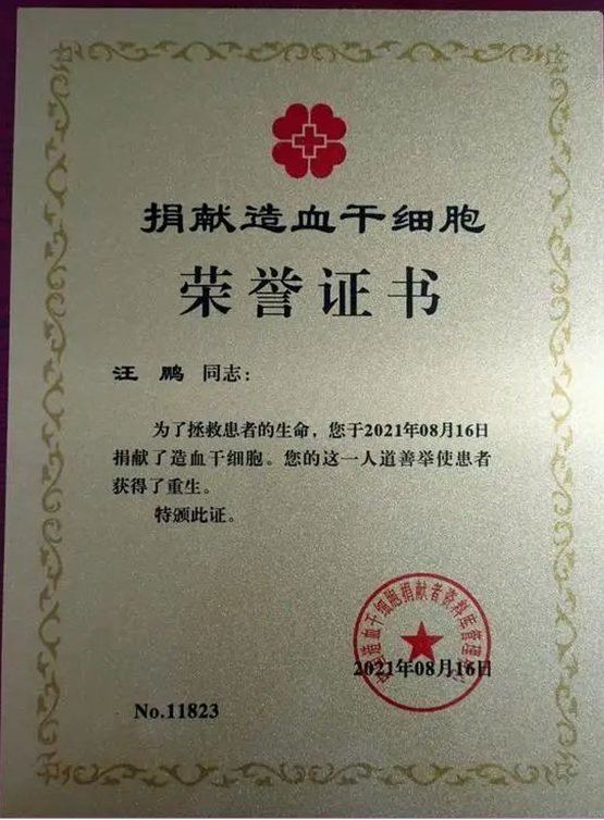2021年8月16日,汪鹏为浙江温州一位患者捐献了造血干细胞,2021年11月,他再次接到中国造血干细胞捐献者资料库云南省分库工作人员打来的电话,告知他曾救过的那位患者病情复发,急需他的淋巴细胞救治,汪鹏又毫不犹豫再次进行了捐献。